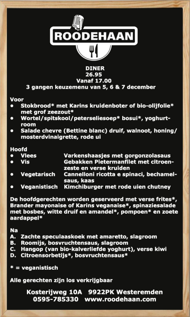 Elke vrijdag, zaterdag en zondag vanaf 16.00 bent u van harte welkom om te borrelen en vanaf 17.00 uur om te dineren en om menu’s en snacks af te halen. Naast de “vaste” menukaart biedt Roodehaan een elke week wisselend driegangen keuzemenu, alleen een hoofd-voor of nagerecht bestellen is uiteraard ook mogelijk.
