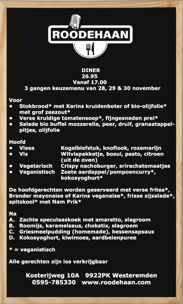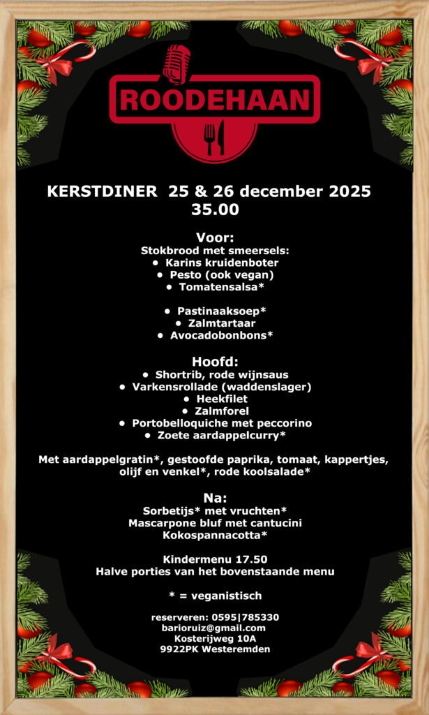Roodehaan eten, drinken & livemuziek Kosterijweg 10A | 9922PK Westeremden 0595 – 785330 of barioruiz@gmail.com en whatsapp 0633319752 Open van vrijdag t/m zondag van 16.00 tot ….