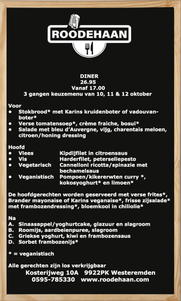 Roodehaan eten, drinken & livemuziek Kosterijweg 10A | 9922PK Westeremden 0595 – 785330 of info@roodehaan.com en whatsapp 0633319752 Open van vrijdag t/m zondag van 16.00 tot ….