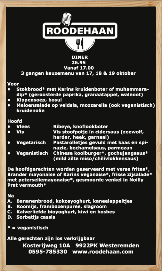 Roodehaan eten, drinken & livemuziek Kosterijweg 10A | 9922PK Westeremden 0595 – 785330 of info@roodehaan.com en whatsapp 0633319752 Open van vrijdag t/m zondag van 16.00 tot ….