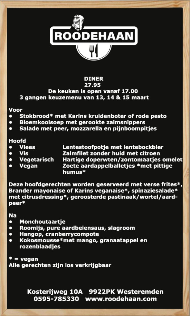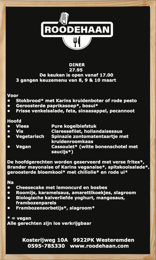 Roodehaan eten, drinken & livemuziek Kosterijweg 10A | 9922PK Westeremden 0595 – 785330 of barioruiz@gmail.com en whatsapp 0633319752 Open van vrijdag t/m zondag van 16.00 tot ….