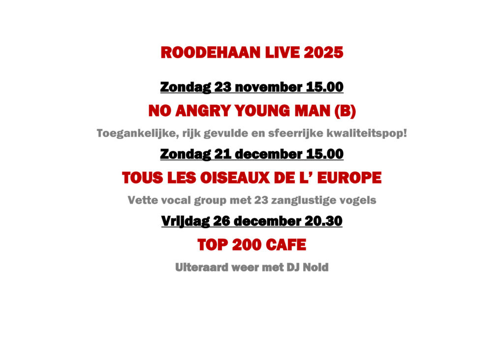 Roodehaan live in Westeremden staat garant voor kwalitatieve en spannende concerten van allerlei muzieksoorten. Twee wekelijks op zaterdag en/of zondag een tof liveconcert met bijzondere muzikanten uit binnen- en buitenland!