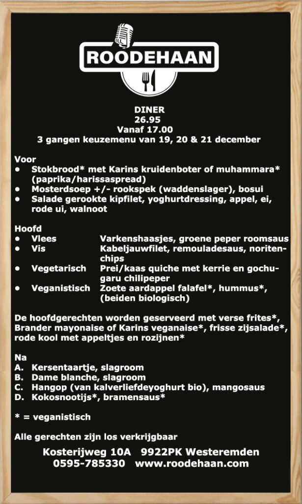 Roodehaan eten, drinken & livemuziek Kosterijweg 10A | 9922PK Westeremden 0595 – 785330 of barioruiz@gmail.com en whatsapp 0633319752 Open van vrijdag t/m zondag van 16.00 tot ….